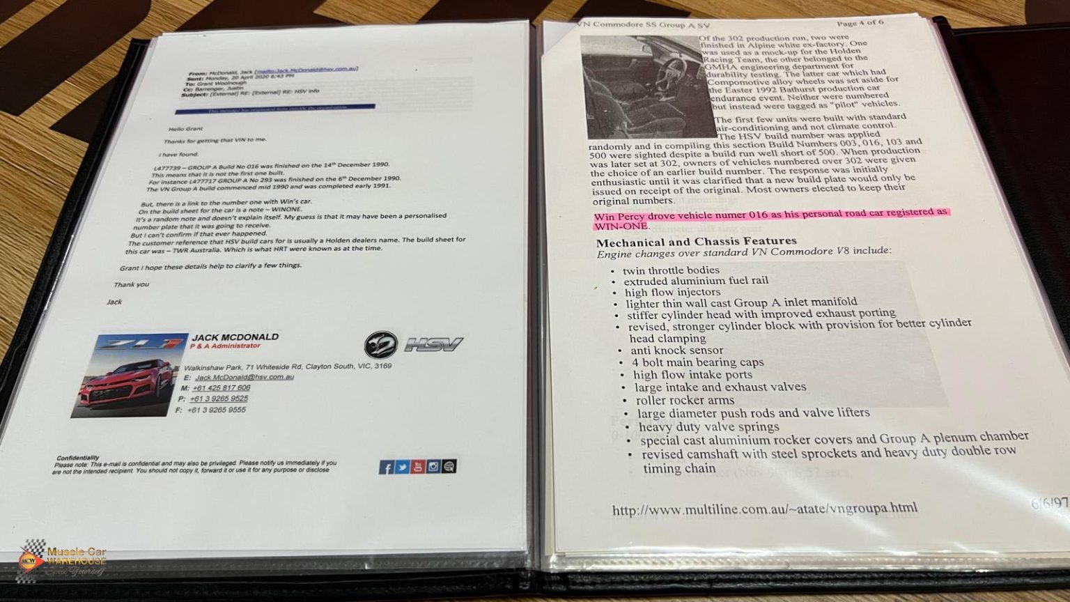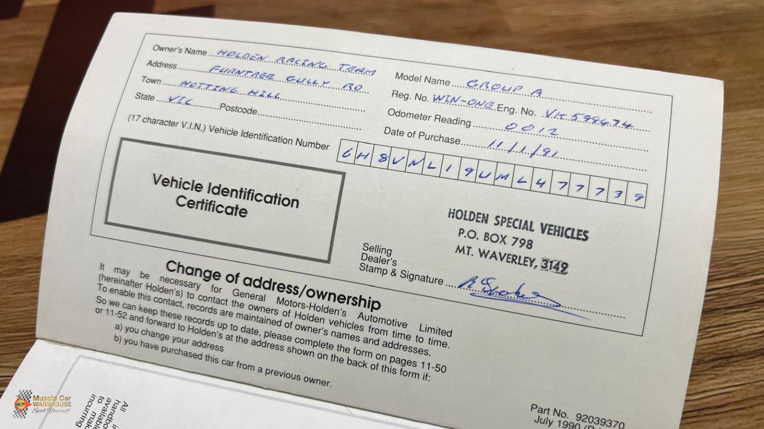 As if a Holden VN Group A wasn’t special enough as it is. With only 302 examples ever produced by Holden in 1990. Of them cars one very special car was awarded to Win Percy by Tom Walkinshaw Racing and the Holden Racing Team for winning the 1990 Bathurst 1000 race. Win was a three-time British Touring Car Champion and went on to make five starts at the Bathurst 1000 with the Holden Racing Team. This beautiful example sports a few special features such as unique “TWR” decals, a Telecom mobile phone and was originally fitted with Dunlop tyres as both Dunlop and Telecom were sponsors of the Holden Racing Team. Another unique feature is the build number, 016 which matches the number of Win’s Bathurst winning Commodore. Even the spare wheel still wears one of the Dunlop tyres. Further to this, the VN has only travelled a staggeringly low 35,000 kilometres and has been cherished by all of its owners and is in fantastic unrestored condition. The VN is complete with its original logbooks, owners-manual and an extensive amount of other paperwork and brochures including the original “WINONE” number plates. This Group A is an absolute must for any Holden or HSV collector. Please contact one of our friendly staff to make an appointment to view this car at our Kogarah showroom.